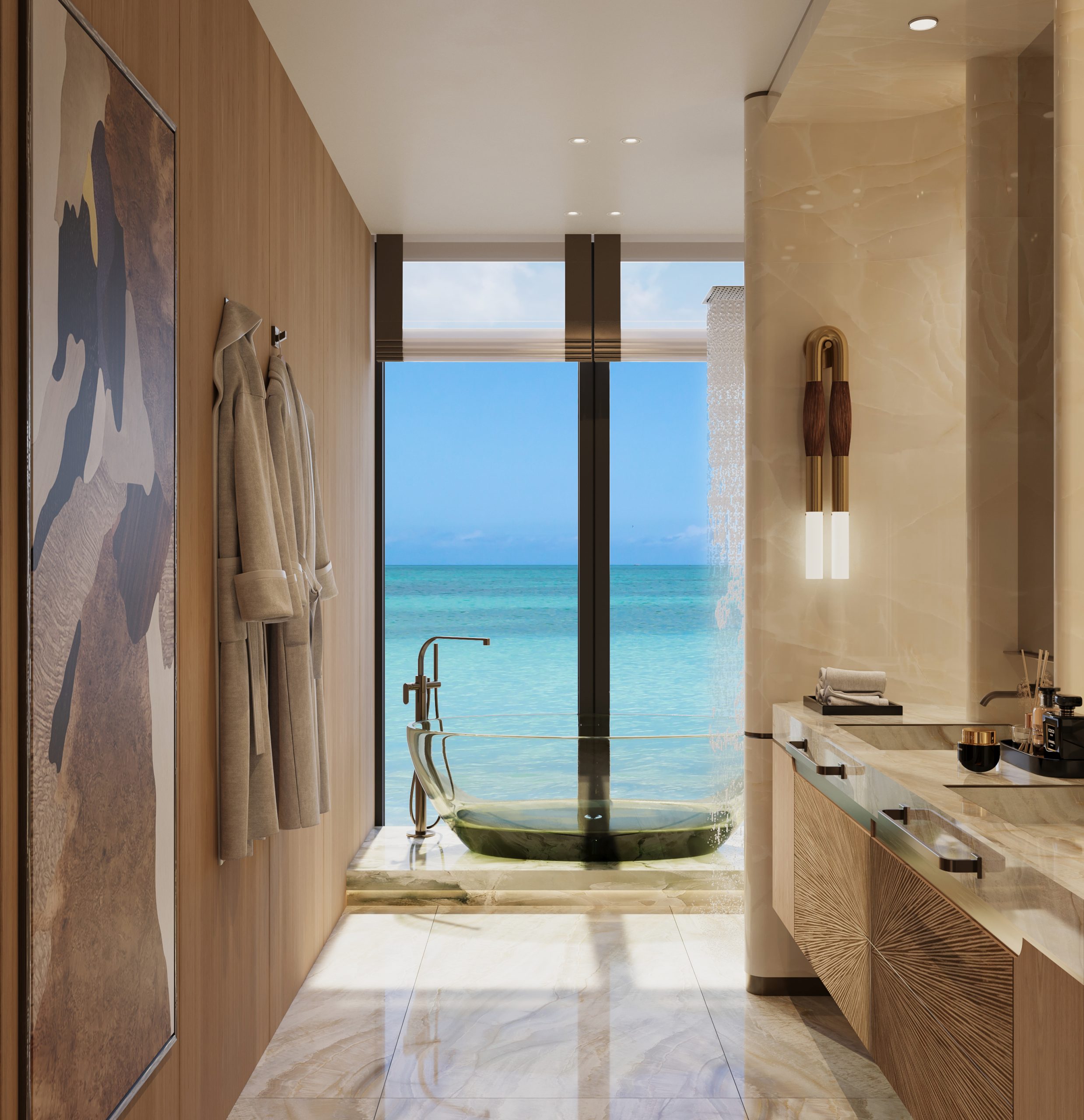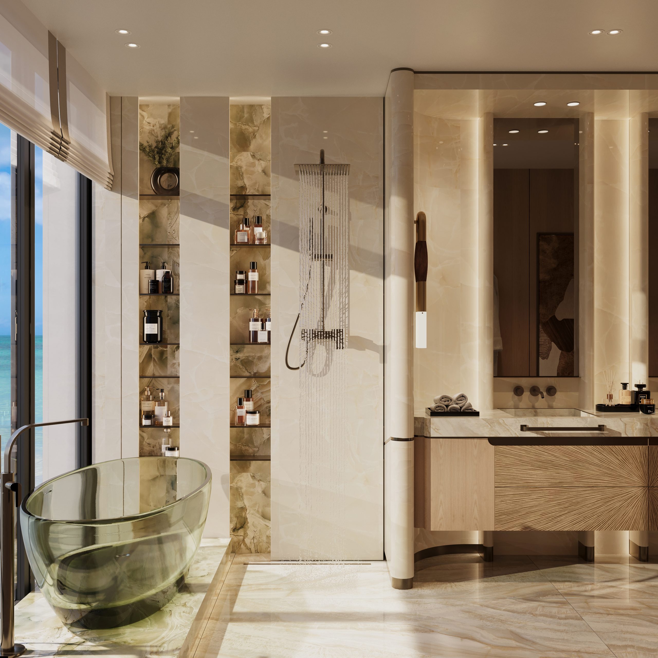 The spa-like bathroom elevates daily rituals into a sensorial experience, with backlit onyx surfaces, sculptural vanities, and a statement glass soaking tub positioned to capture natural light and ocean views. Thoughtfully integrated storage, custom fixtures, and warm ambient lighting complete the atmosphere of refined retreat.