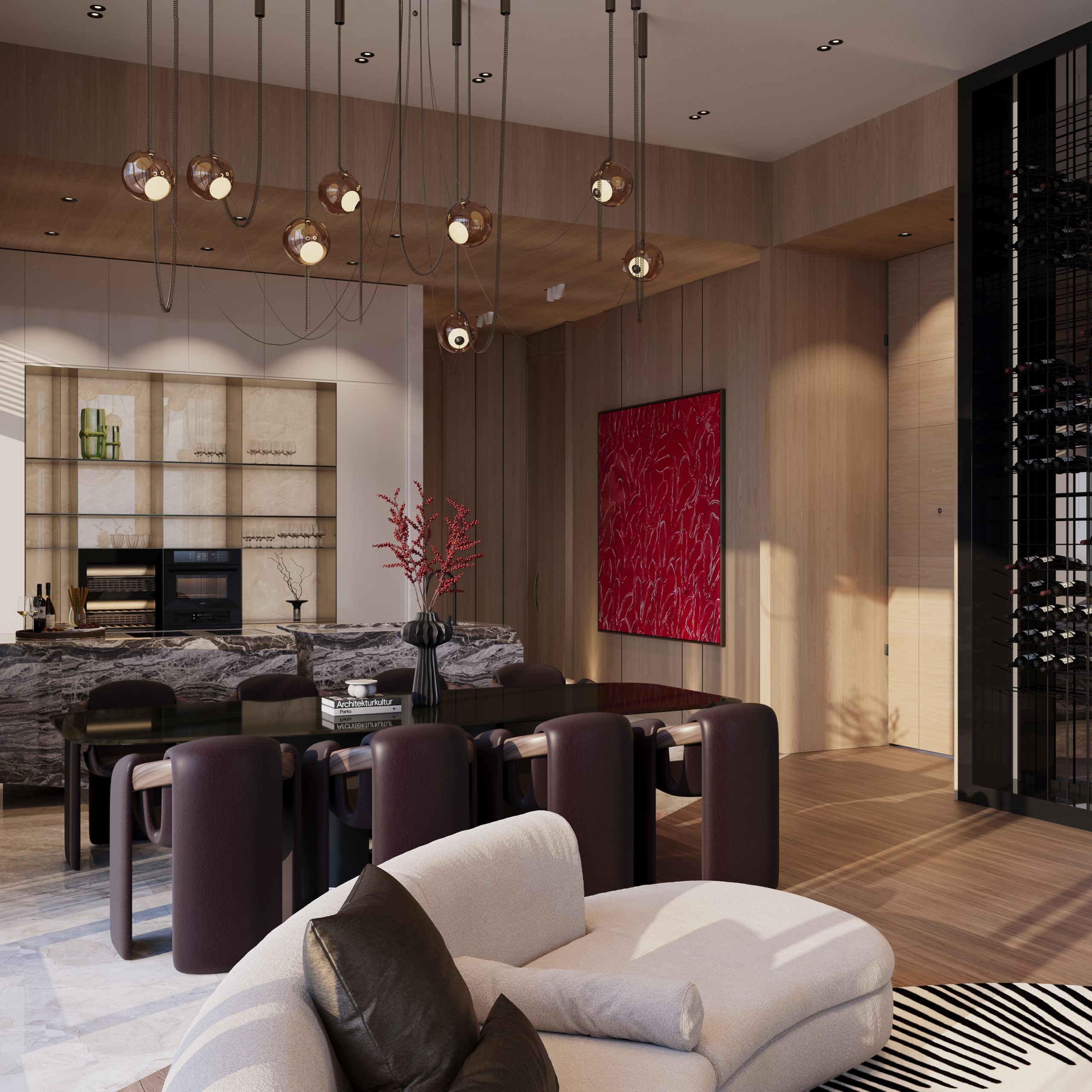 The living and dining areas are conceived as an open yet intimate composition, anchored by sculptural custom furniture and statement lighting elements. Layered textures, fluid forms, and panoramic waterfront views work together to create a tranquil yet expressive atmosphere. A custom stone island and integrated display shelving define the kitchen as both a functional centerpiece and a visual focal point, merging craftsmanship with modern performance.