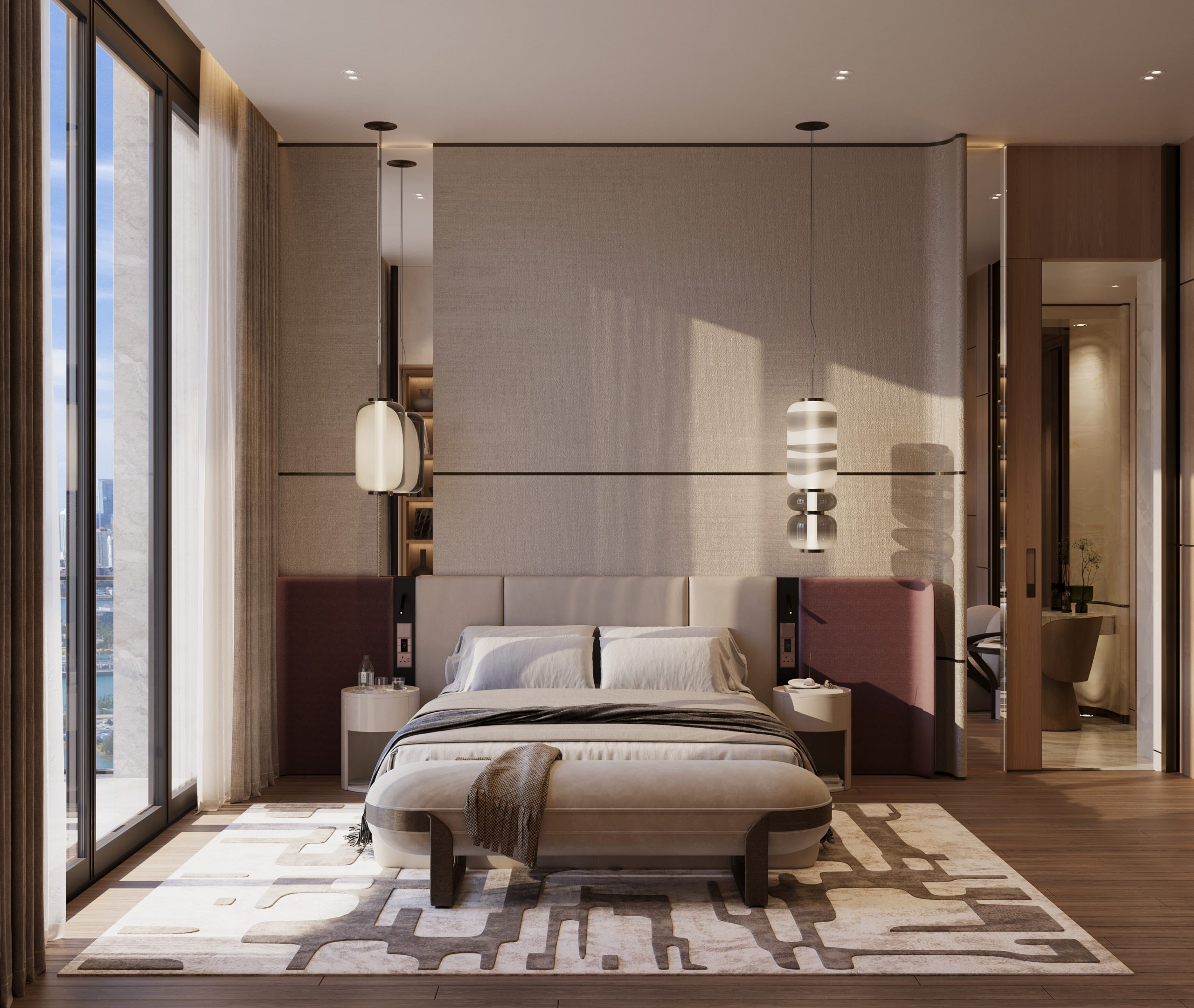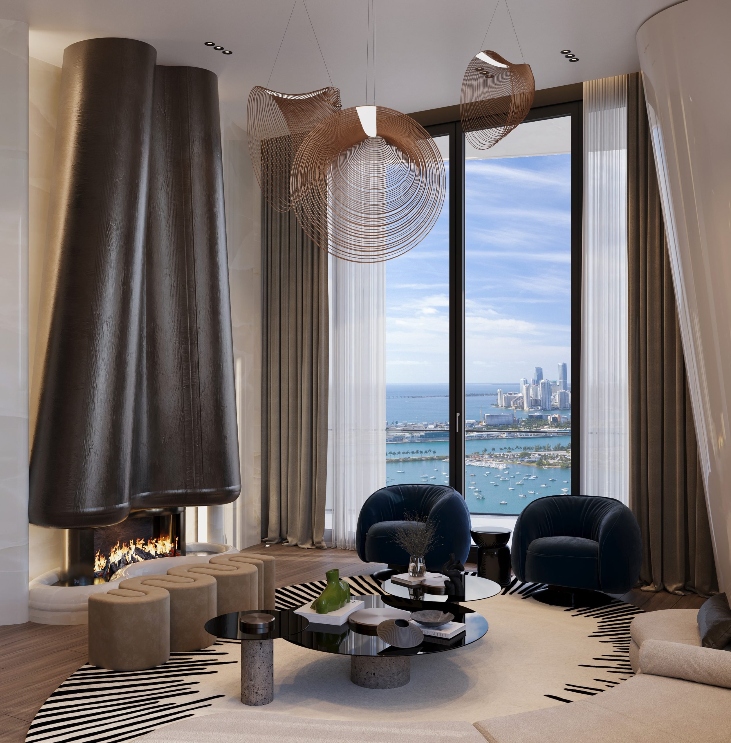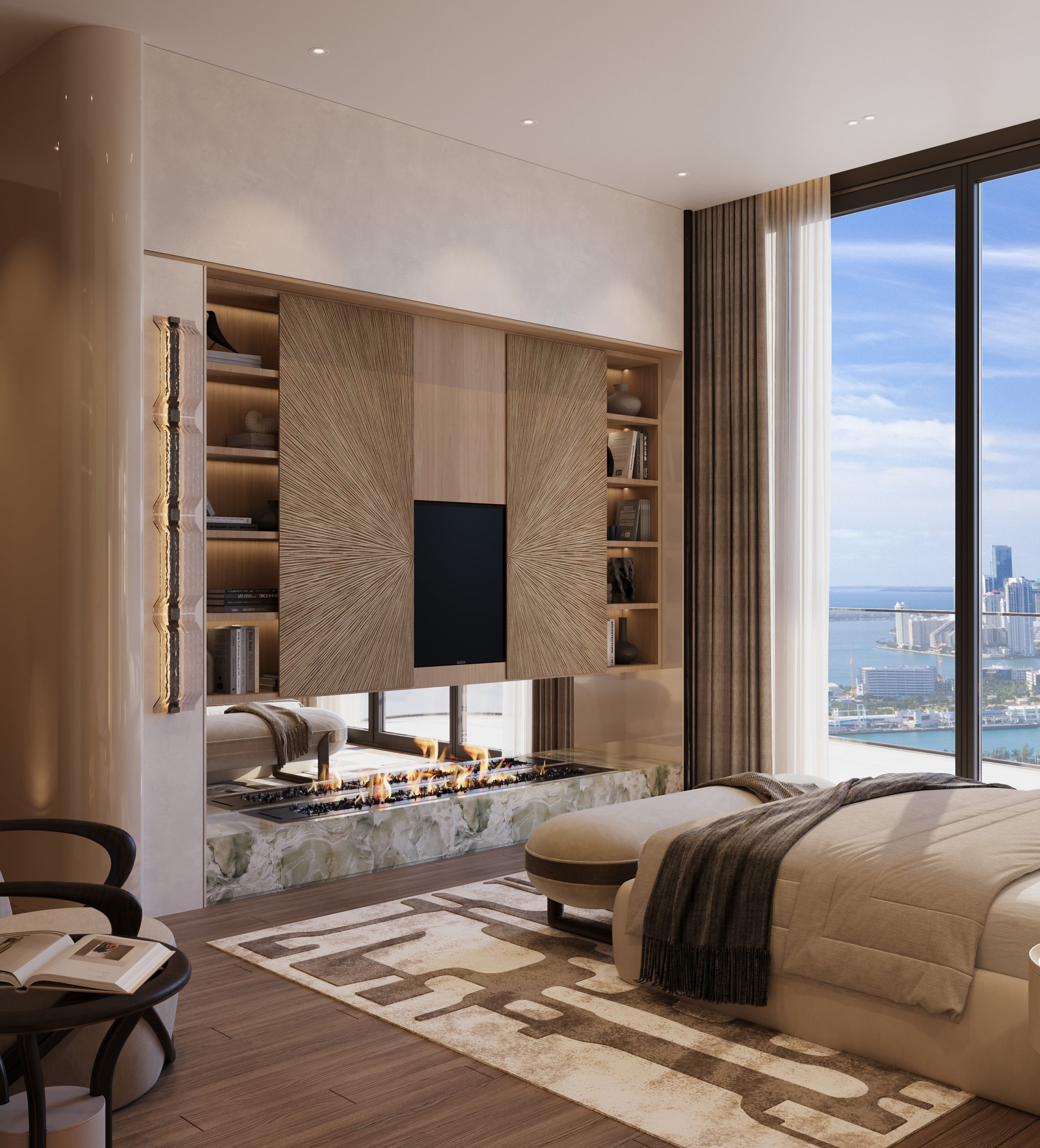The bedroom suite continues the narrative of understated elegance, featuring custom millwork, integrated lighting, and a soft, enveloping palette that promotes rest and serenity. A sculptural fireplace and built-in shelving add depth and architectural interest, while floor-to-ceiling glazing frames the Miami skyline.