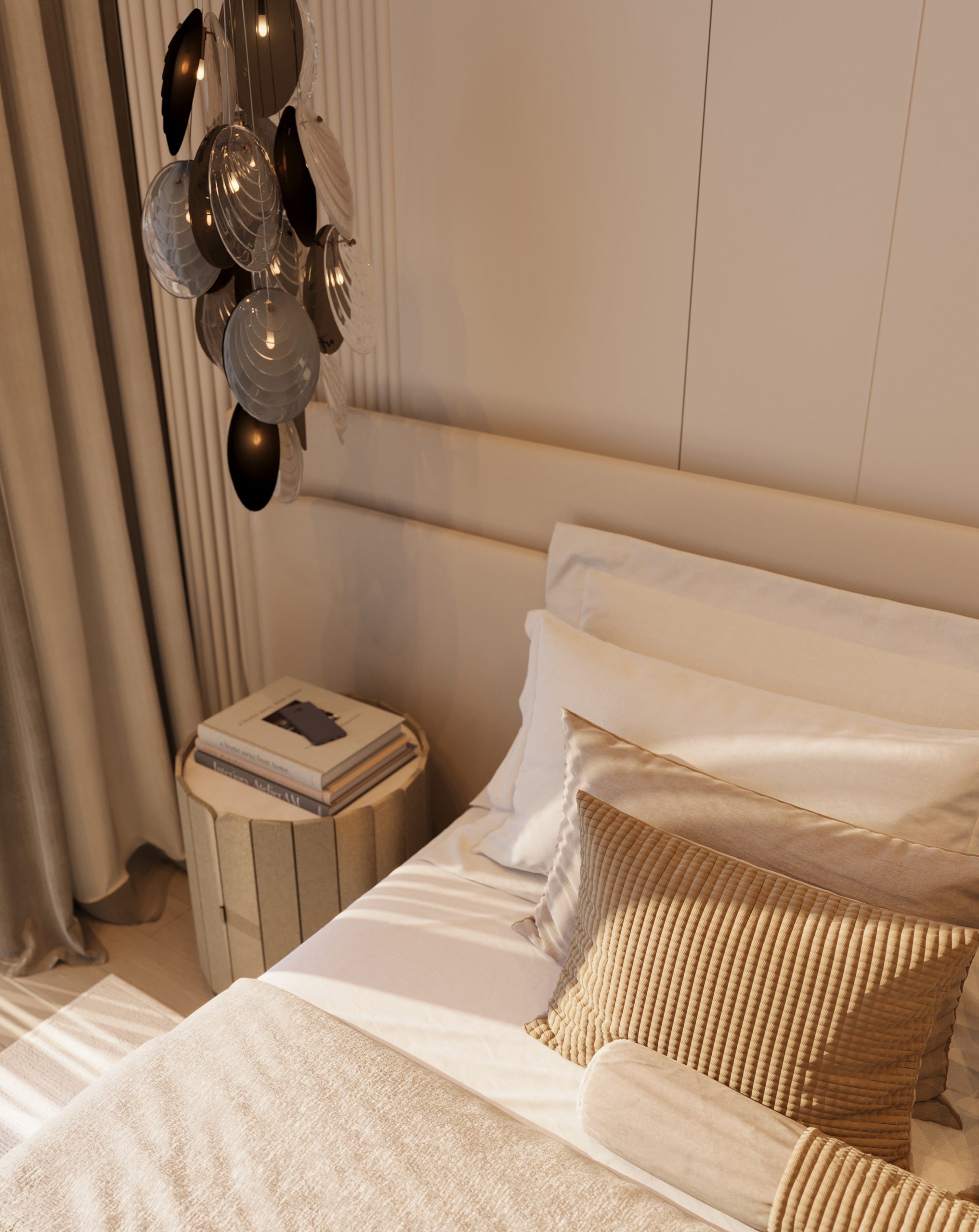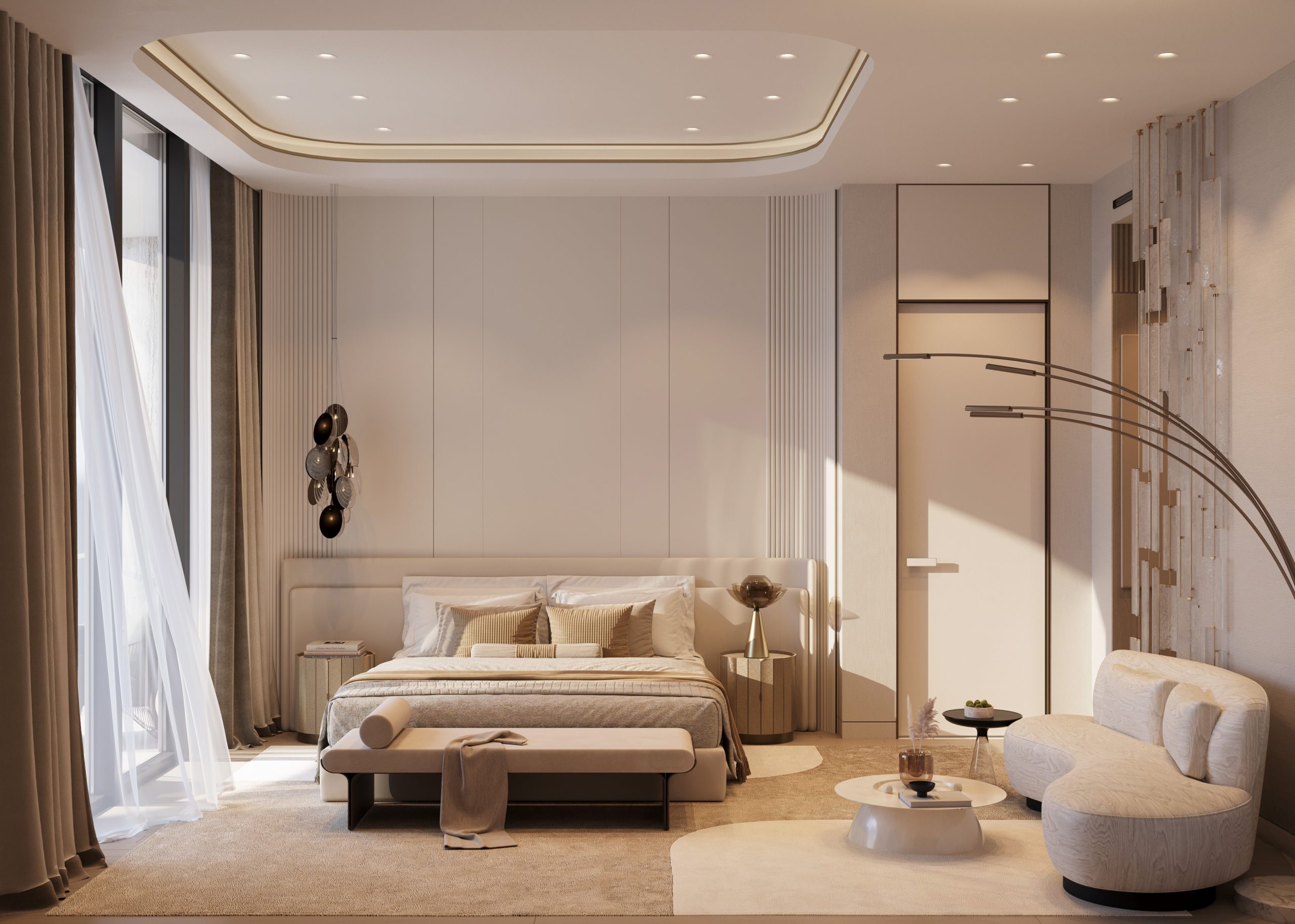 The bedroom is envisioned as a tranquil retreat, defined by a restrained palette, tactile finishes, and tailored lighting. Upholstered elements, soft rugs, and sculptural seating create an intimate atmosphere, while custom wall treatments and ceiling details add architectural interest without visual noise.