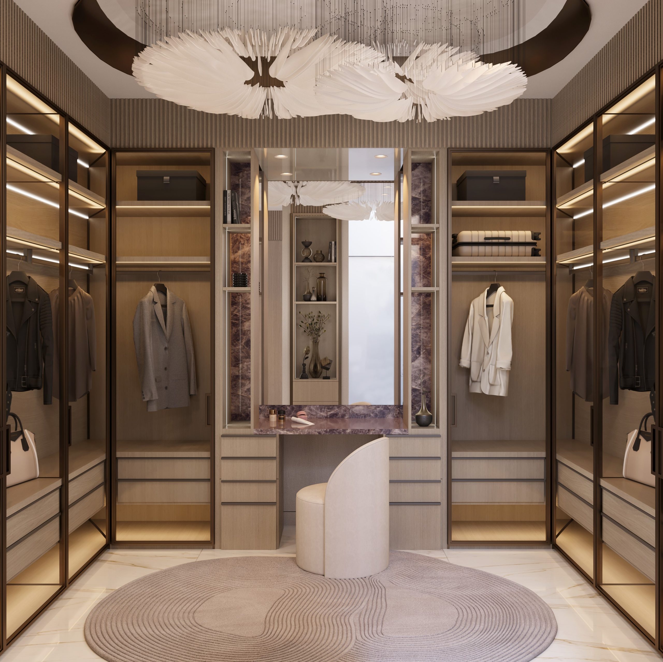 The walk-in closet is designed as a refined, boutique-like space. Custom millwork, integrated lighting, and stone accents elevate functionality into an experiential environment. Symmetry, proportion, and material contrast define the space, while a central vanity introduces both elegance and practicality.