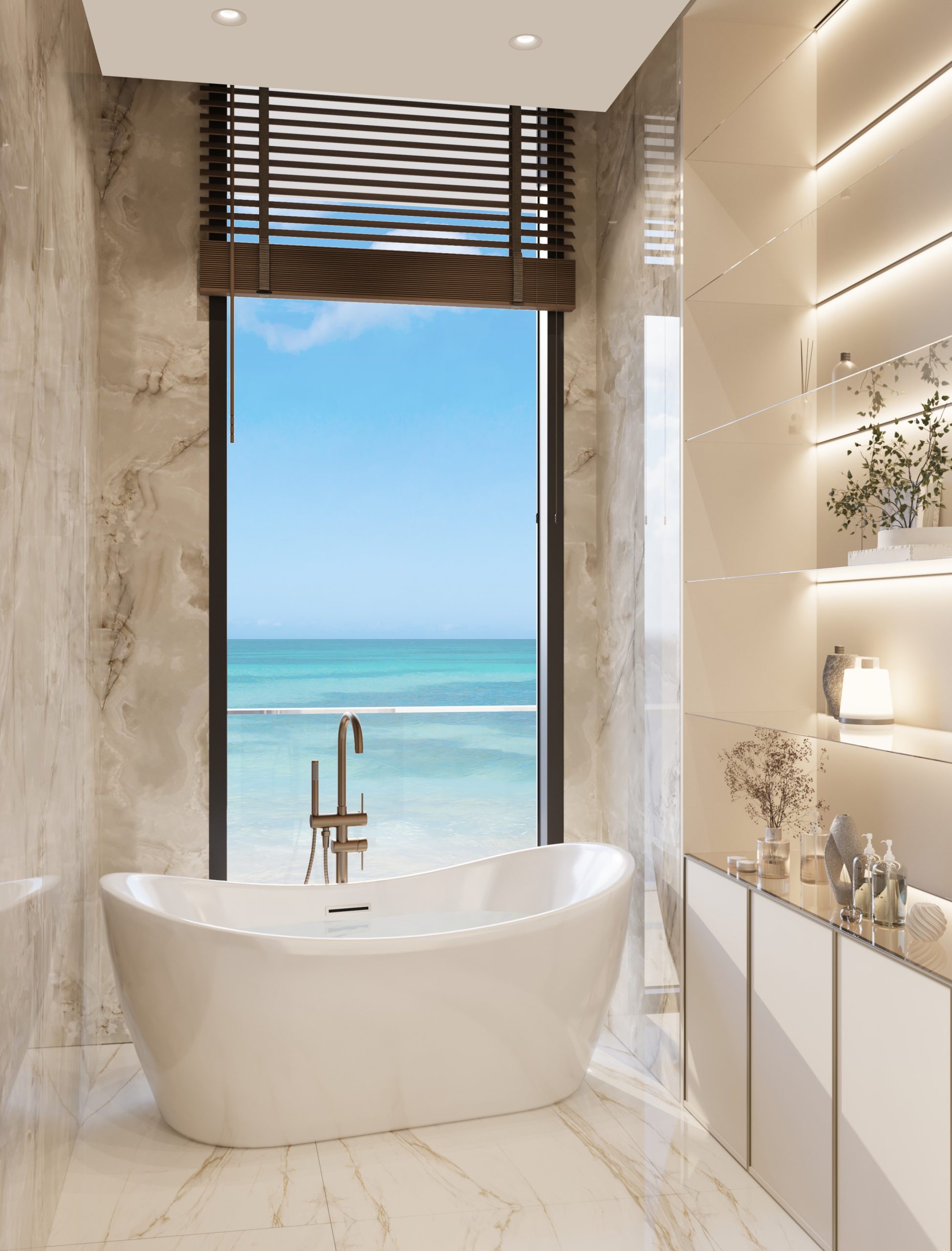 Bathrooms are conceived as spa-inspired sanctuaries. Dramatic stone surfaces, floating vanities, and sculptural fixtures create a serene and immersive experience. Freestanding elements, warm metallic accents, and layered lighting transform daily rituals into moments of understated luxury.