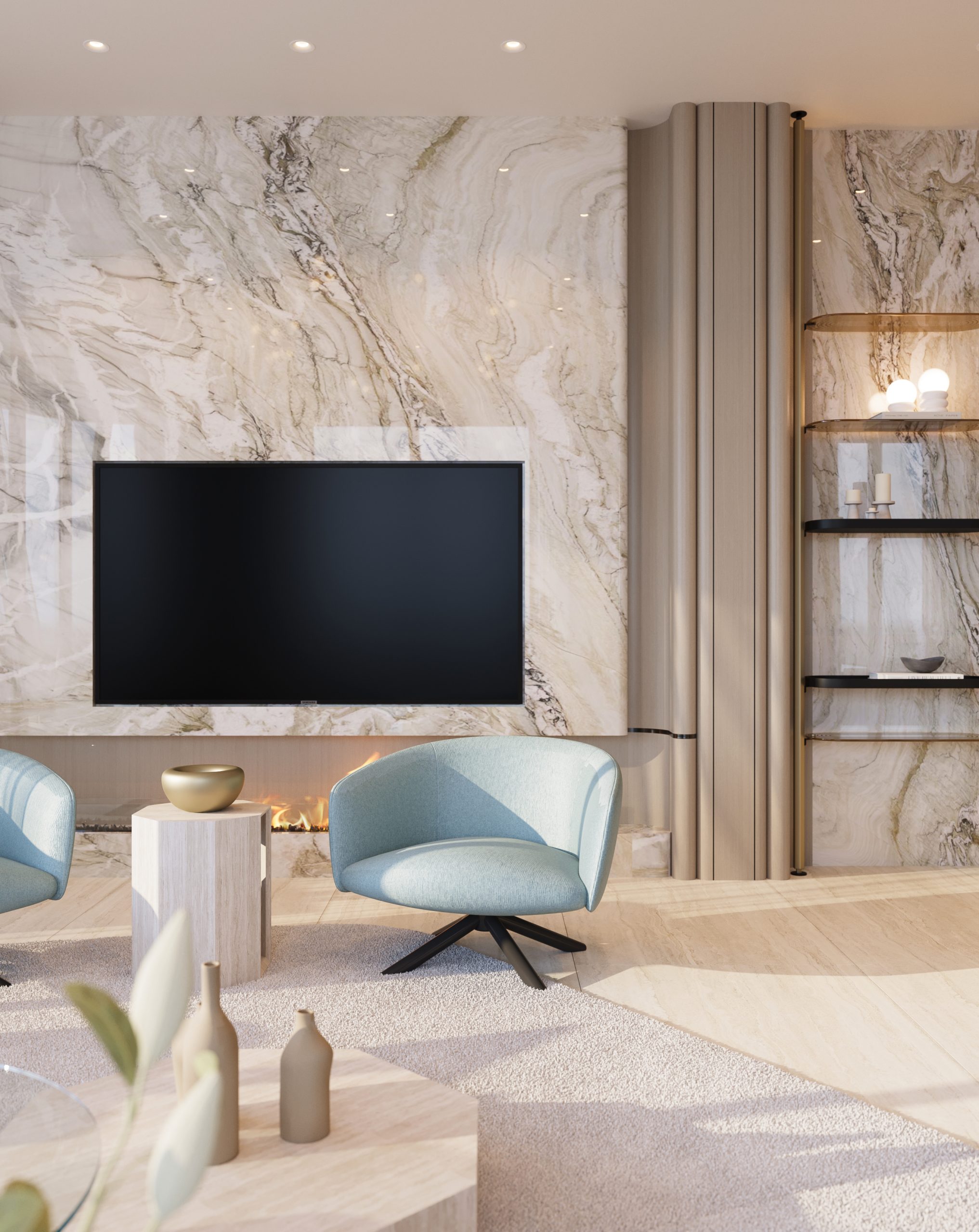 The living areas are conceived as fluid, light-filled environments framed by expansive glazing. Curved seating compositions anchor the space, introducing softness against the architectural backdrop of stone-clad walls and integrated millwork. A custom marble feature wall, paired with a linear fireplace and minimal shelving, creates a strong focal point while maintaining visual calm.