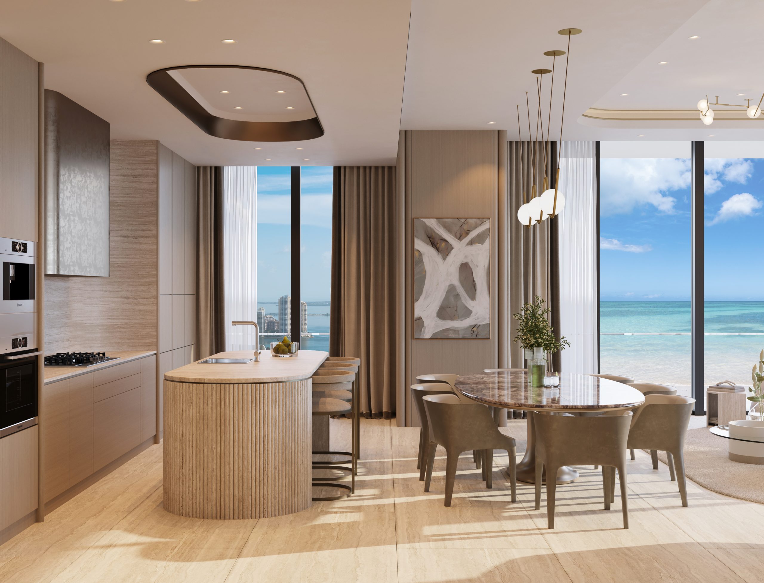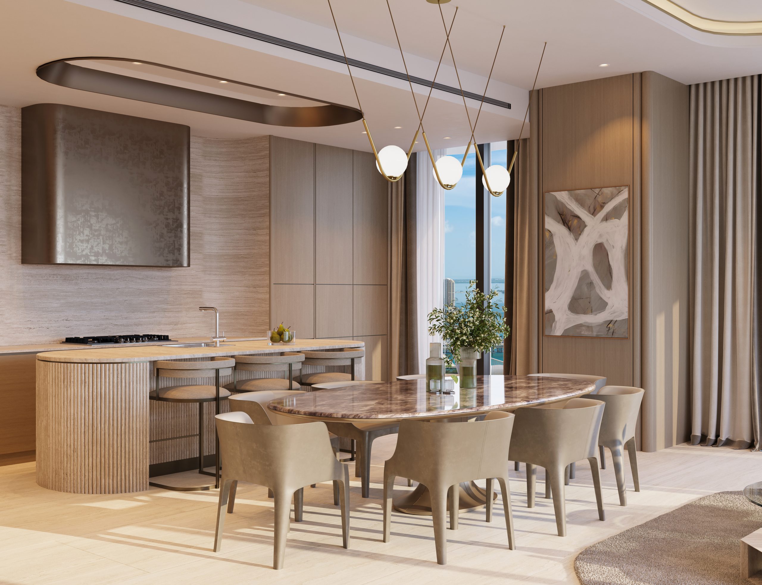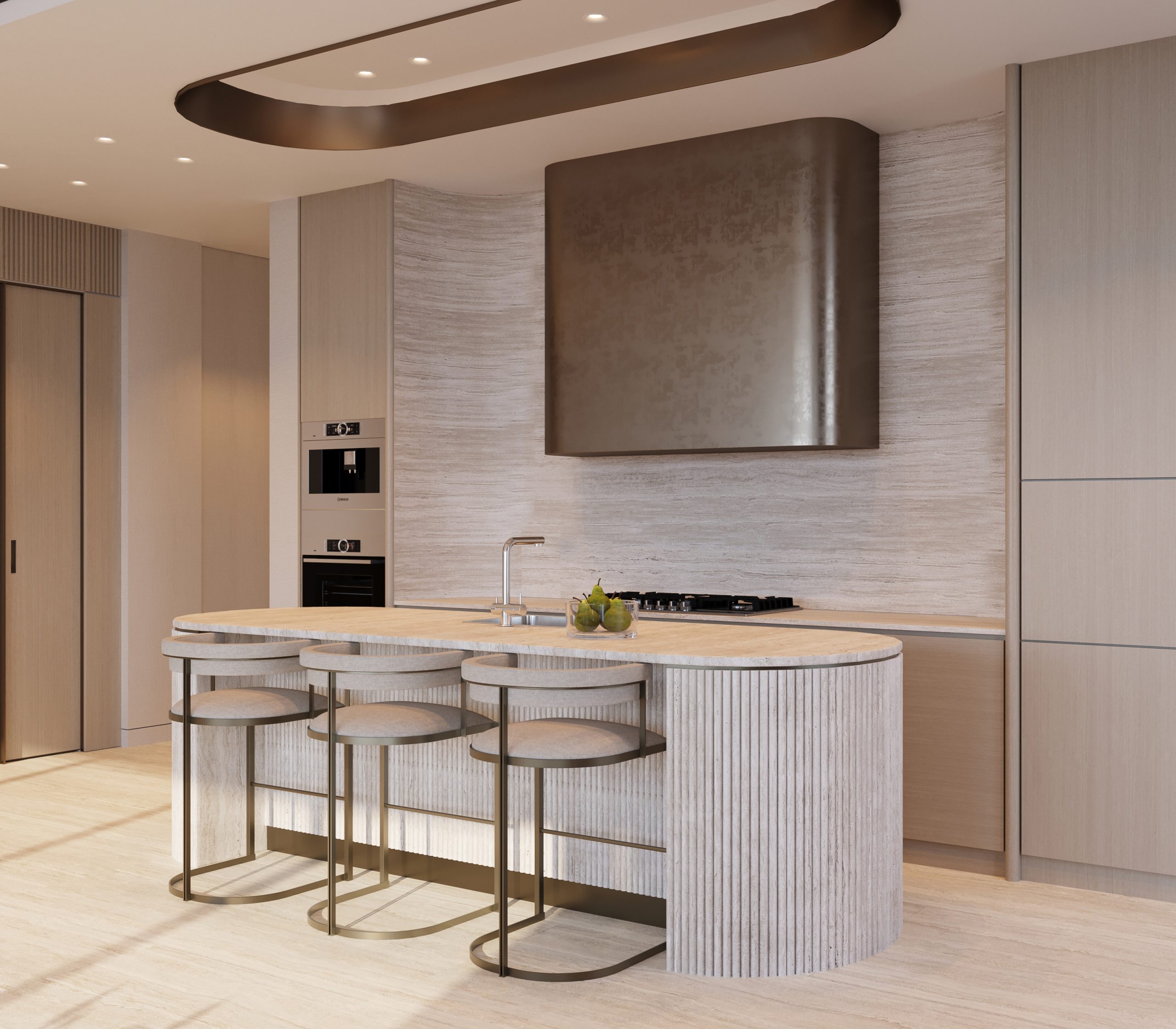 The kitchen balances functionality with architectural presence. A curved stone island with fluted detailing serves as both a visual centerpiece and a social hub. Integrated appliances, warm wood cabinetry, and subtle lighting details maintain a seamless and sophisticated aesthetic while prioritizing usability.