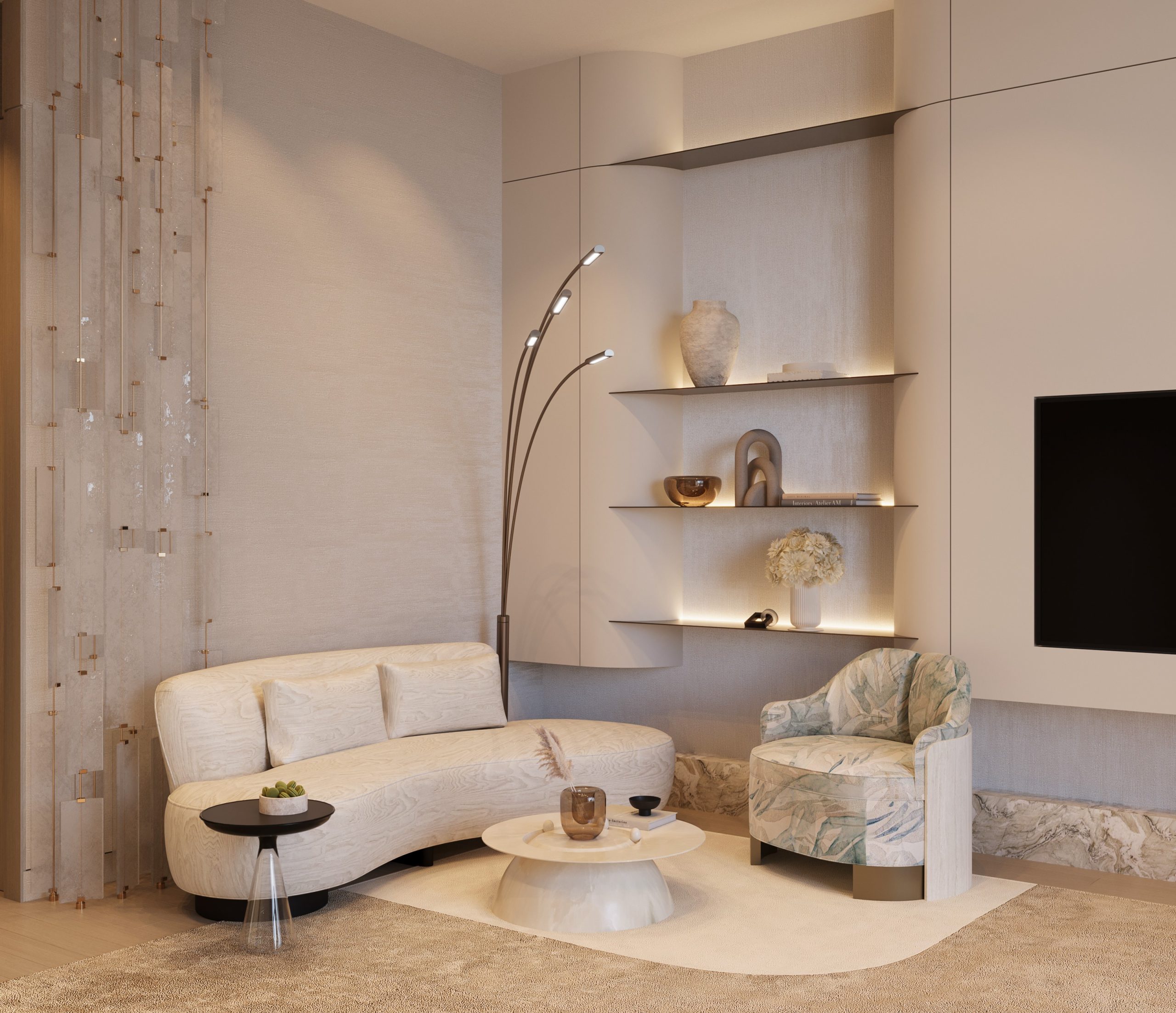 The design concept is rooted in soft geometry, layered neutrals, and expressive natural materials, creating a serene yet elevated atmosphere throughout the residence. Each space is thoughtfully composed to balance visual impact with comfort, resulting in interiors that feel both sculptural and deeply livable.