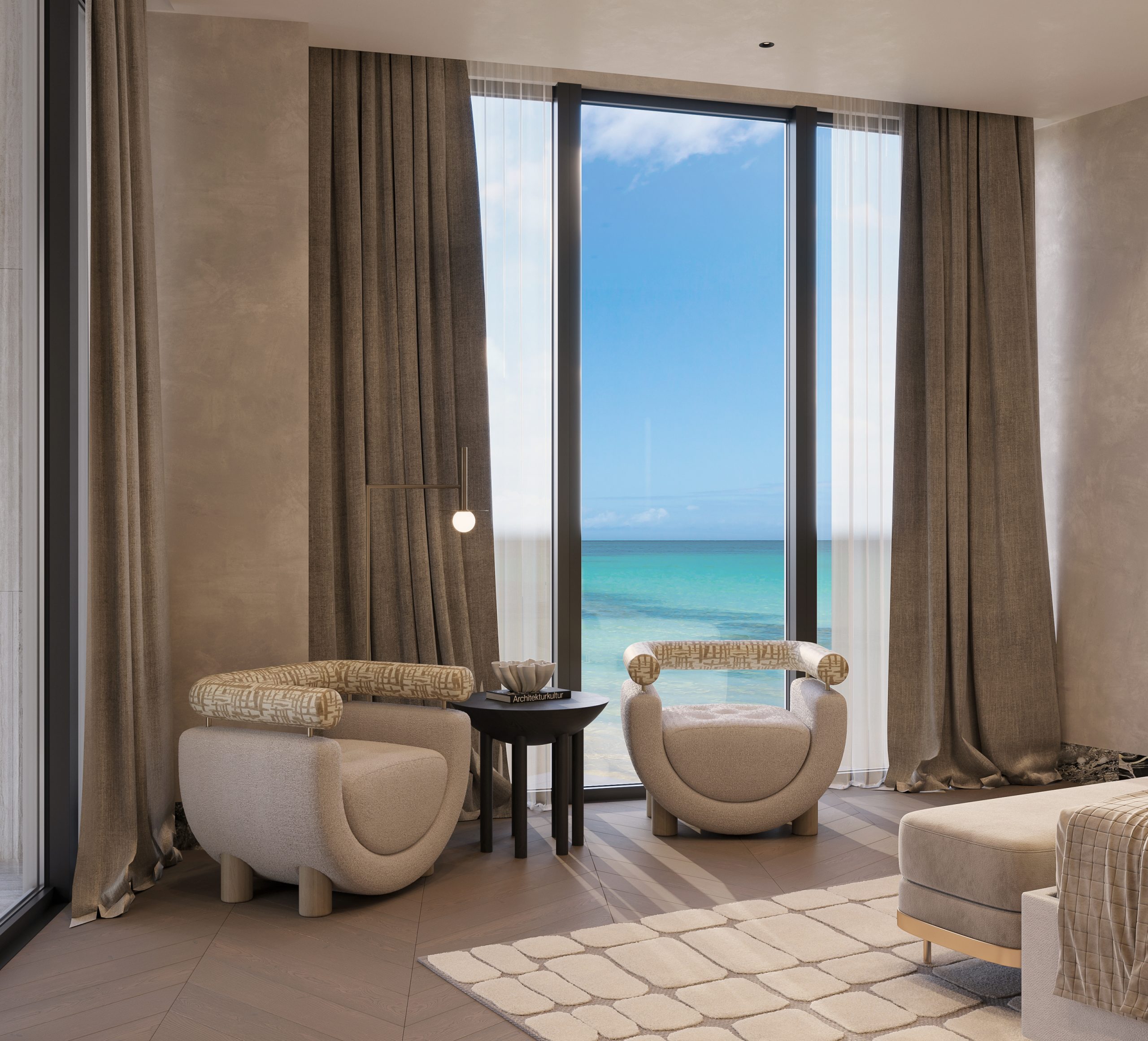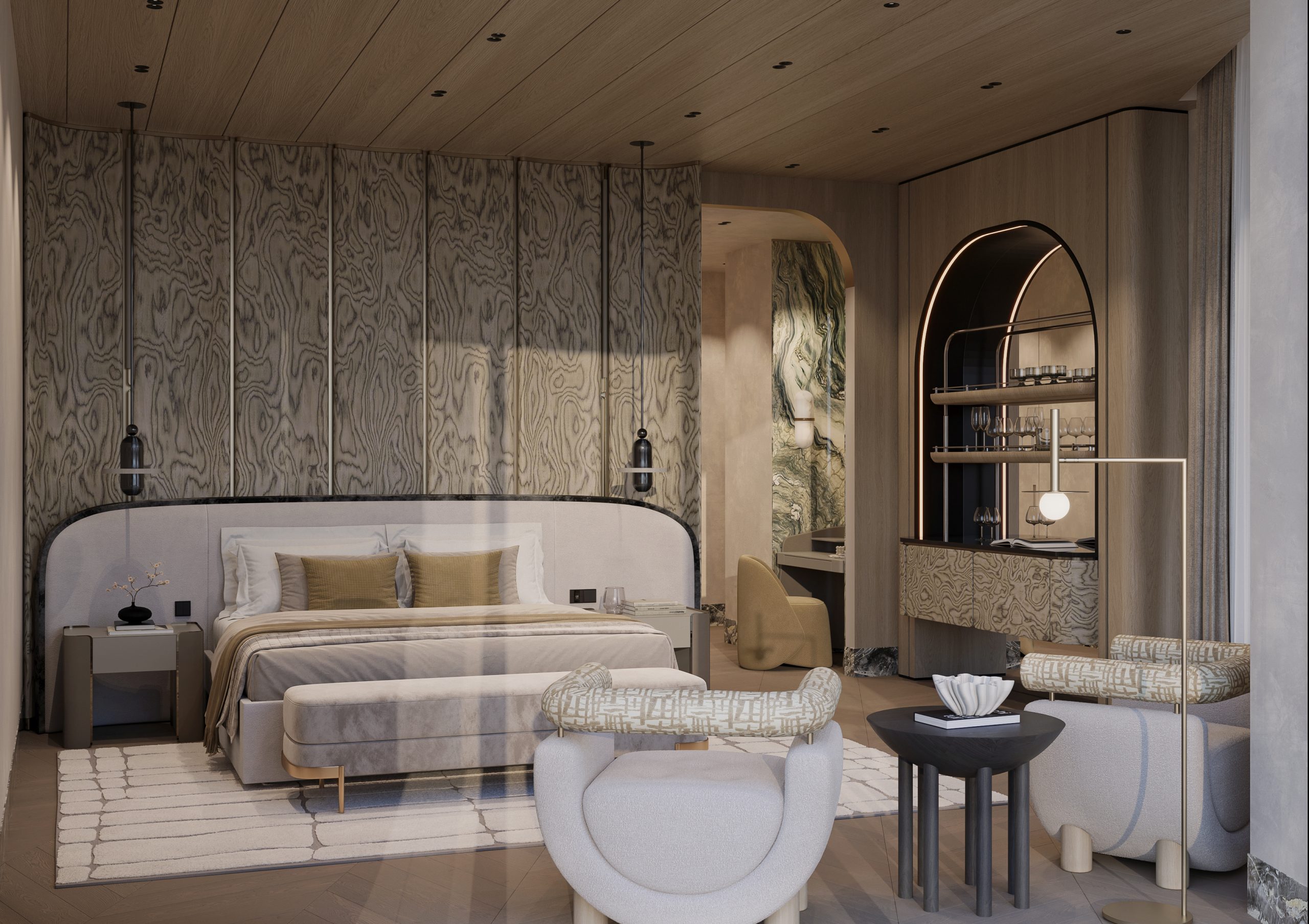 The master bedroom is envisioned as a serene retreat, where soft textures, warm wood tones, and tailored lighting establish a calm and restorative environment. Sculptural lounge seating and carefully curated details elevate the space while maintaining a sense of ease and comfort.