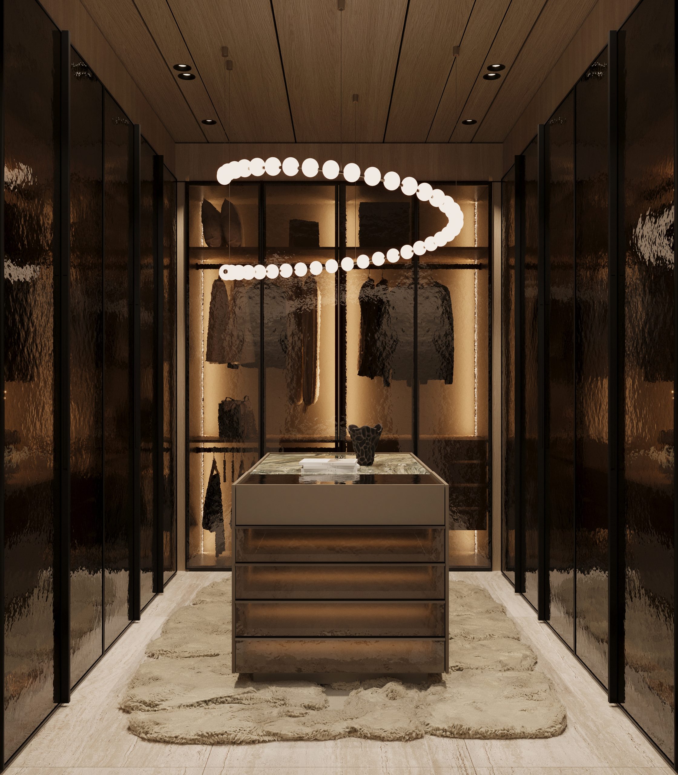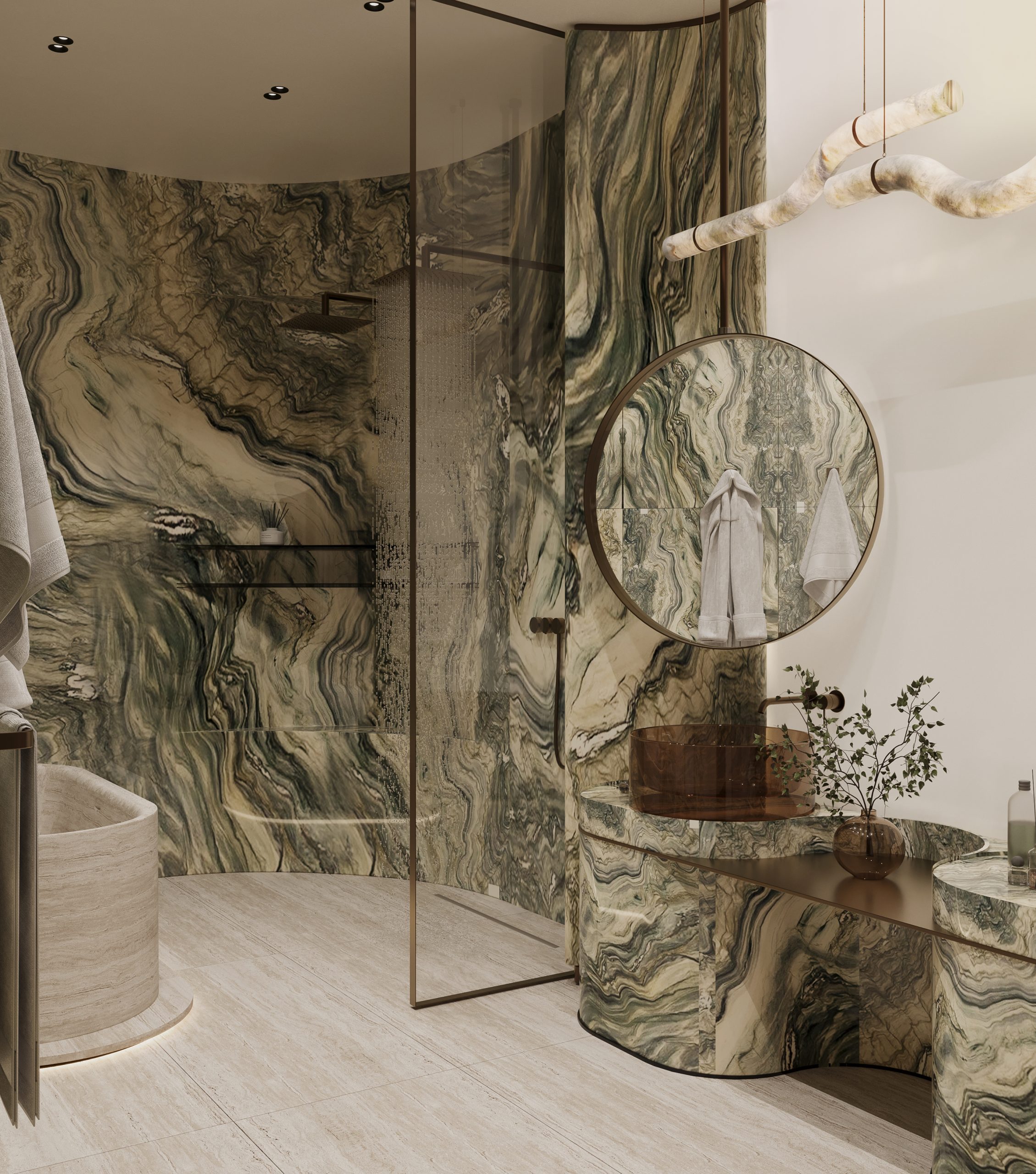 Bathrooms are treated as spa-like sanctuaries, featuring dramatic stone compositions, custom vanities, and sculptural mirrors. Transparency, reflection, and soft lighting transform everyday rituals into refined experiences. The walk-in closet continues this narrative through bespoke cabinetry, ambient illumination, and a sense of quiet luxury.