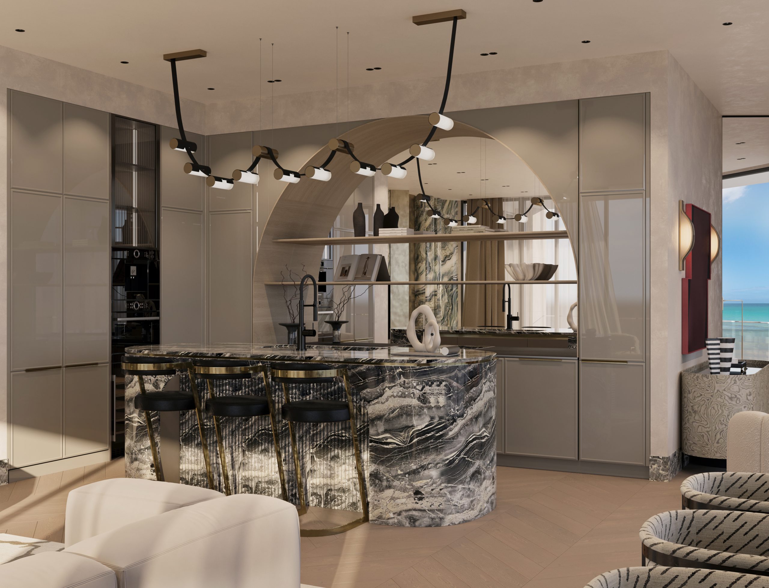 The kitchen is designed as both a functional workspace and a visual centerpiece. A bold stone island with expressive veining anchors the space, complemented by refined cabinetry, integrated appliances, and sculptural lighting. Architectural arches and layered shelving create a seamless transition between utility and design, reinforcing the residence’s cohesive aesthetic.