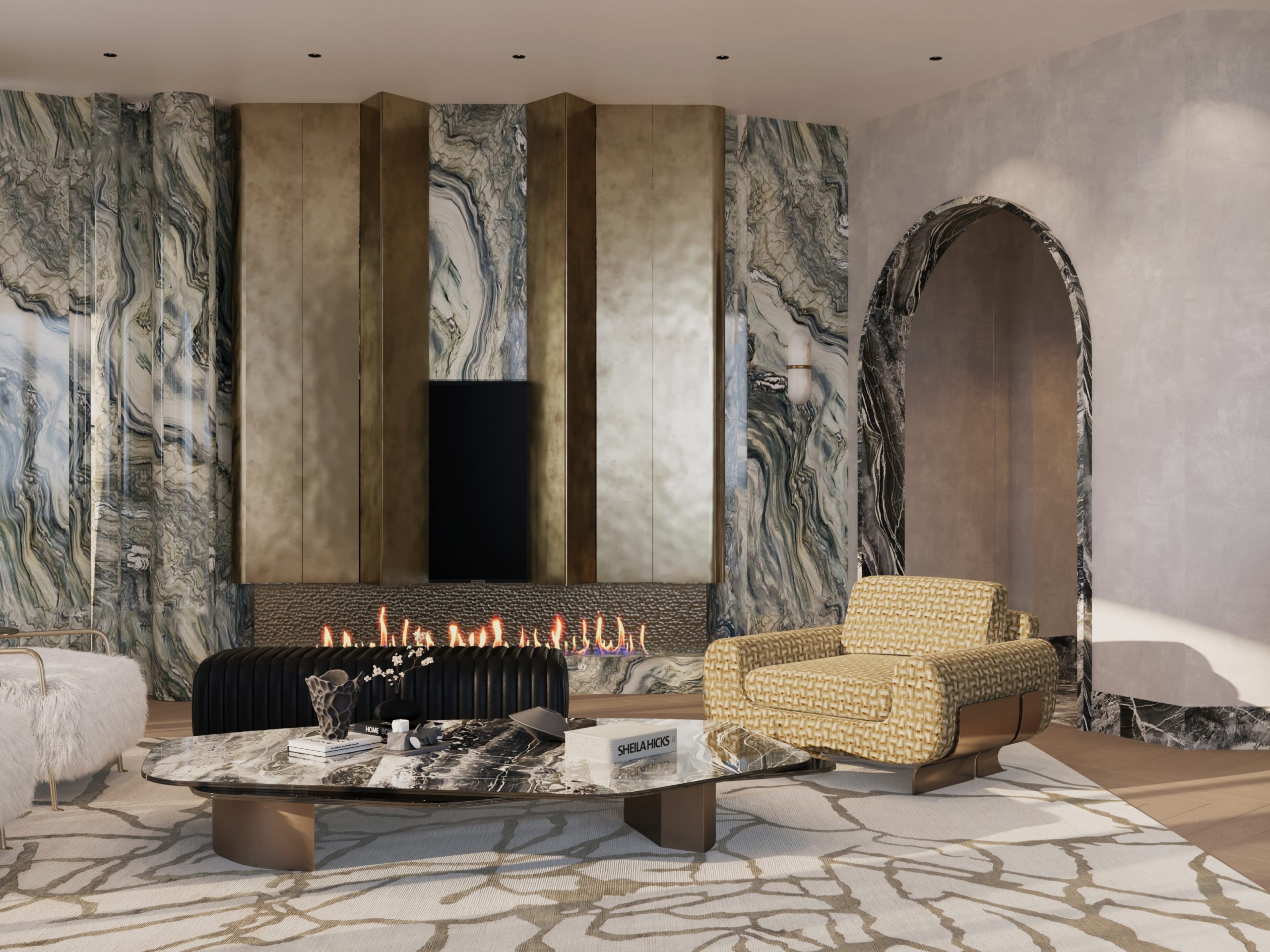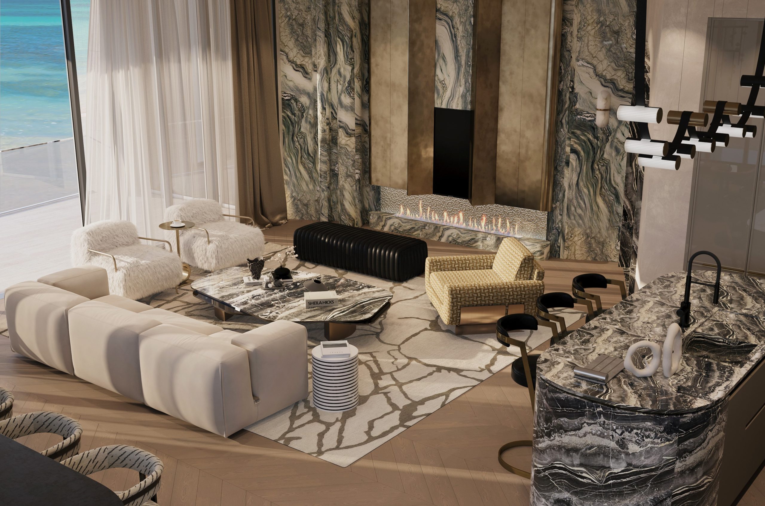 The living areas are conceived as open yet intimate environments, anchored by sculptural seating compositions and custom stone features. Curved sofas, tactile upholstery, and bespoke tables soften the architectural scale, while statement fireplaces and layered lighting introduce warmth and visual depth. Subtle contrasts—matte versus reflective, soft versus structured—create a balanced and inviting atmosphere.