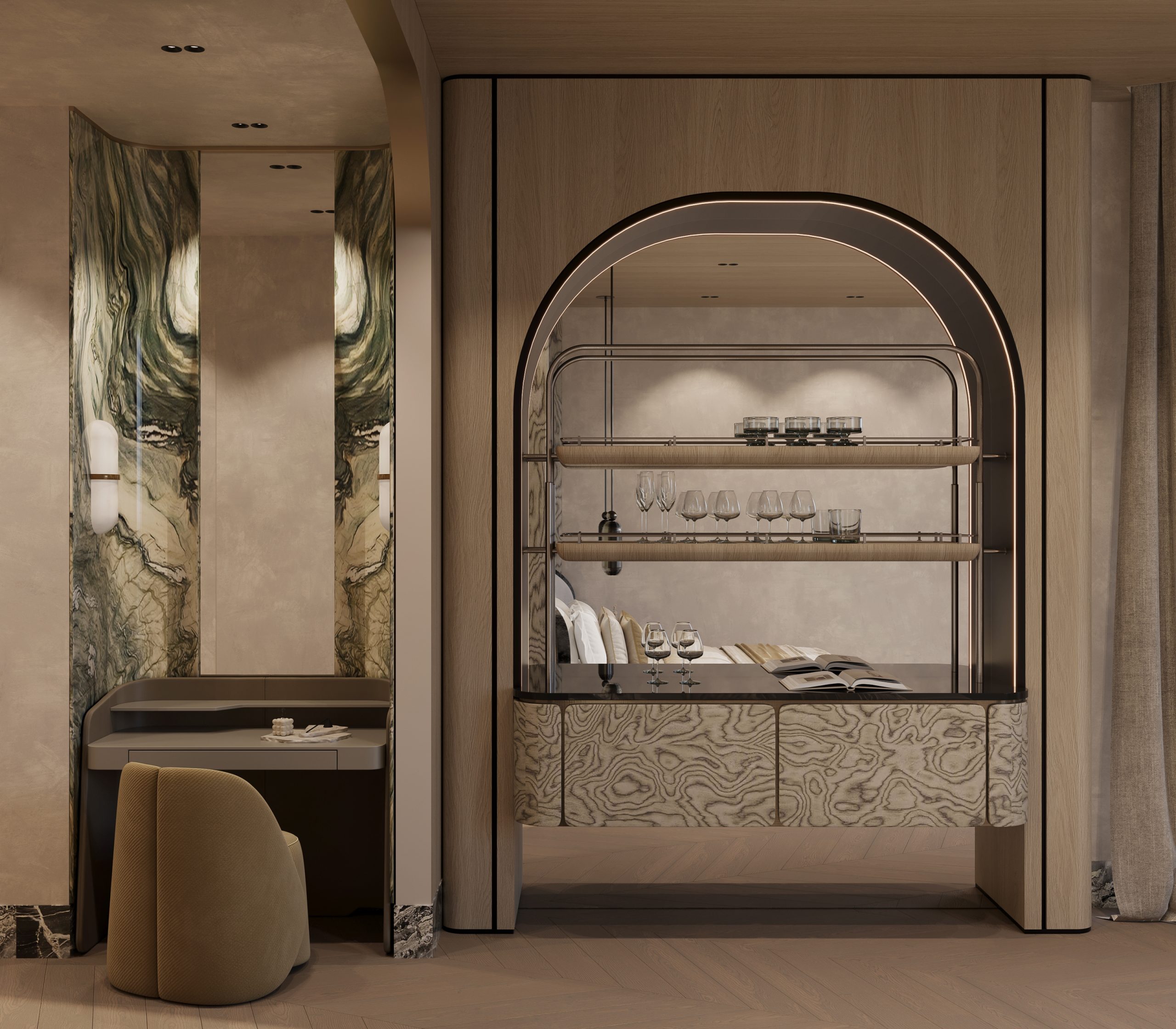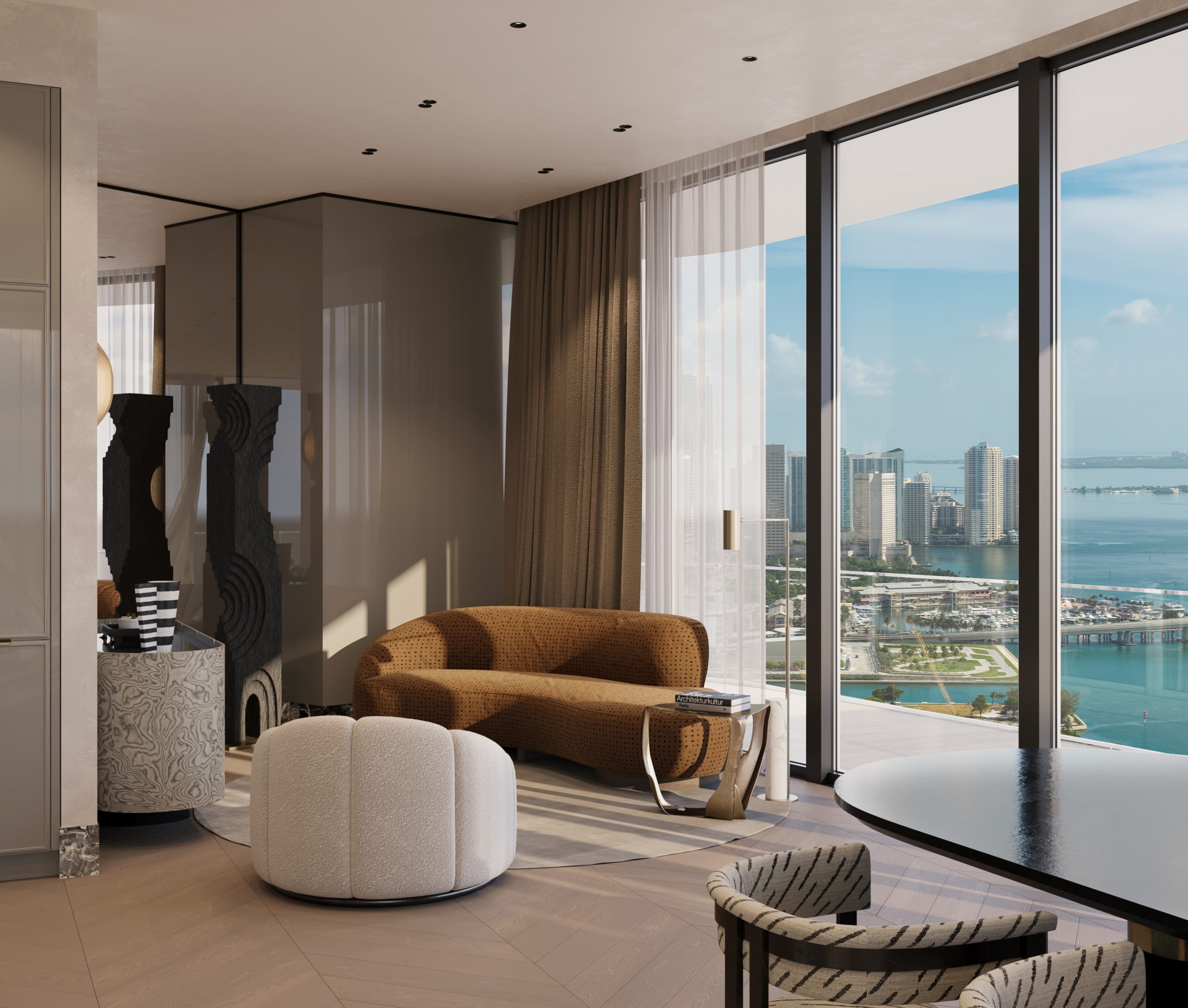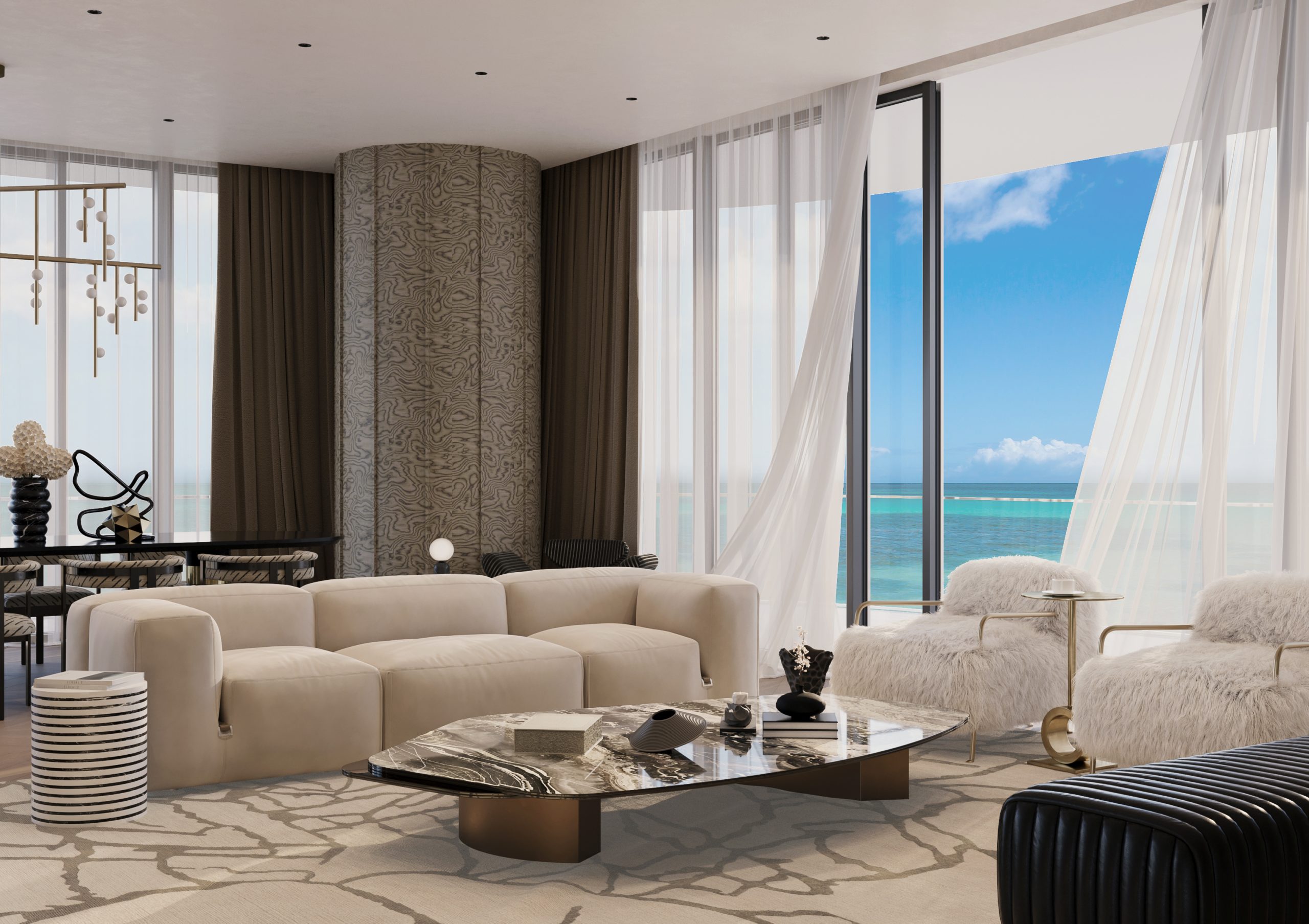 The interior concept is driven by fluid forms, layered textures, and a sophisticated neutral palette, punctuated by sculptural moments and custom-designed elements. Throughout the residence, expansive glazing frames the surrounding views while allowing natural light to interact dynamically with stone, wood, and metallic finishes.
