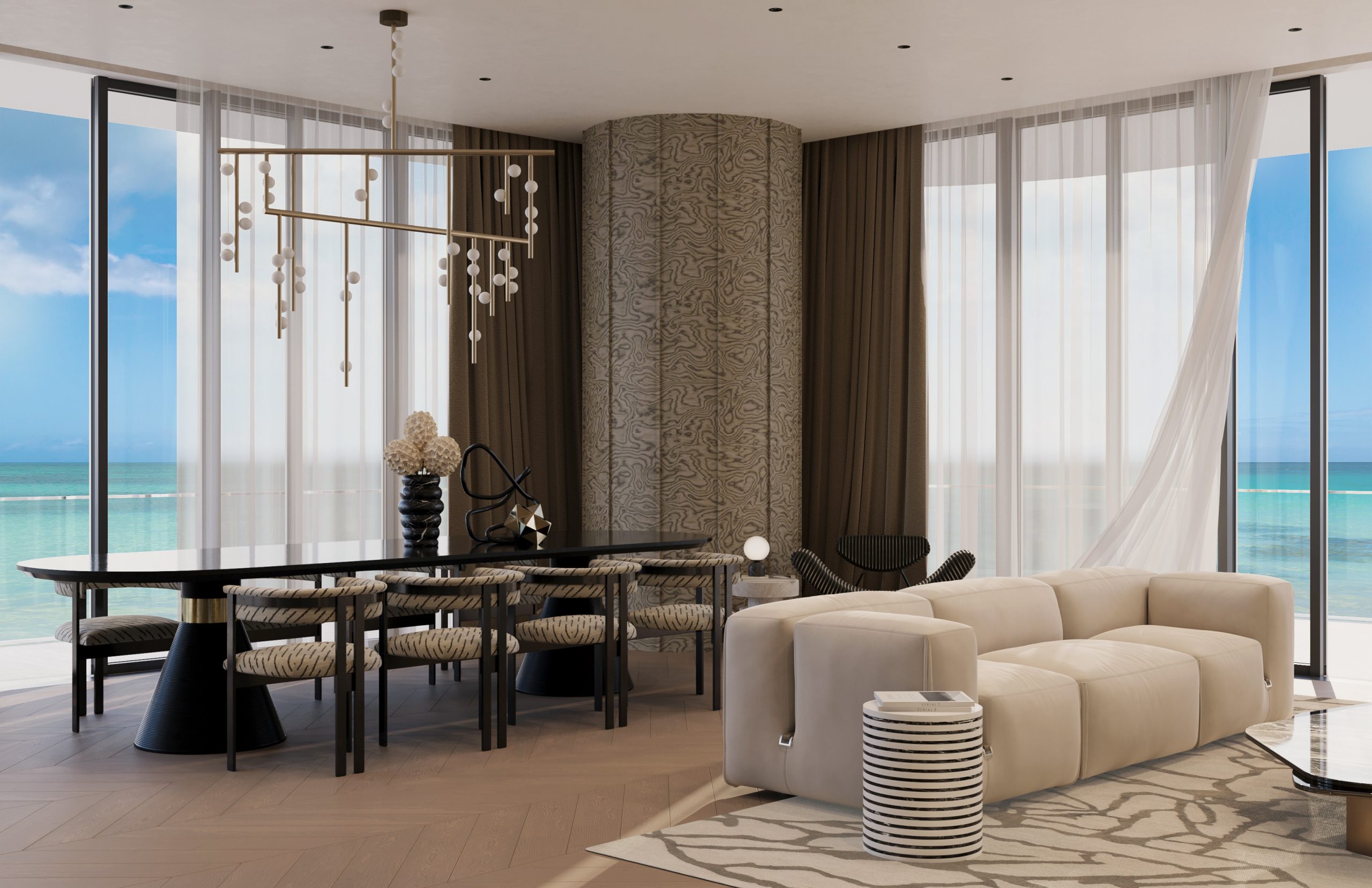 The dining area continues this language with an emphasis on material expression and proportion. A monolithic table, paired with organically shaped chairs and sculptural lighting, establishes a sense of quiet drama while remaining elegant and understated.